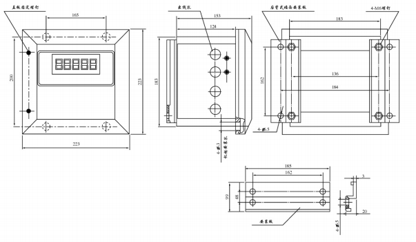 說(shuō)明:根據(jù)用戶安裝需要,顯示儀表有多種安裝方式,如安裝在機(jī)框上。把2塊后背式墻面安裝板卸掉,采用6.3機(jī)框安裝孔;如安裝在墻面,把安裝板用螺釘固定在顯示儀表的底部,然后安裝在墻面上。