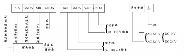 分體式雙色紅外測(cè)溫儀由測(cè)溫探頭、顯示儀表和專(zhuān)用電纜組成。電纜(一般5m,如果用戶需要,可按所需電纜長(zhǎng)度訂購(gòu))。電纜包括電源電纜和信號(hào)電纜,具體接線參見(jiàn)如下端子接線圖: